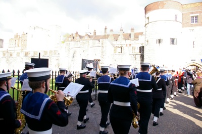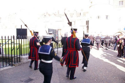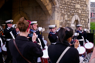 As we're leaving the Tower, we're held up by a military procession. They are bringing "some shiny crystally thing" (according to a journalist covering the parade) into the Tower for a ceremony that's part of the Queen's 60th Jubilee celebration. Once it passes, we get a quick bite (fish 'n chips) at a nearby outdoor snack bar.